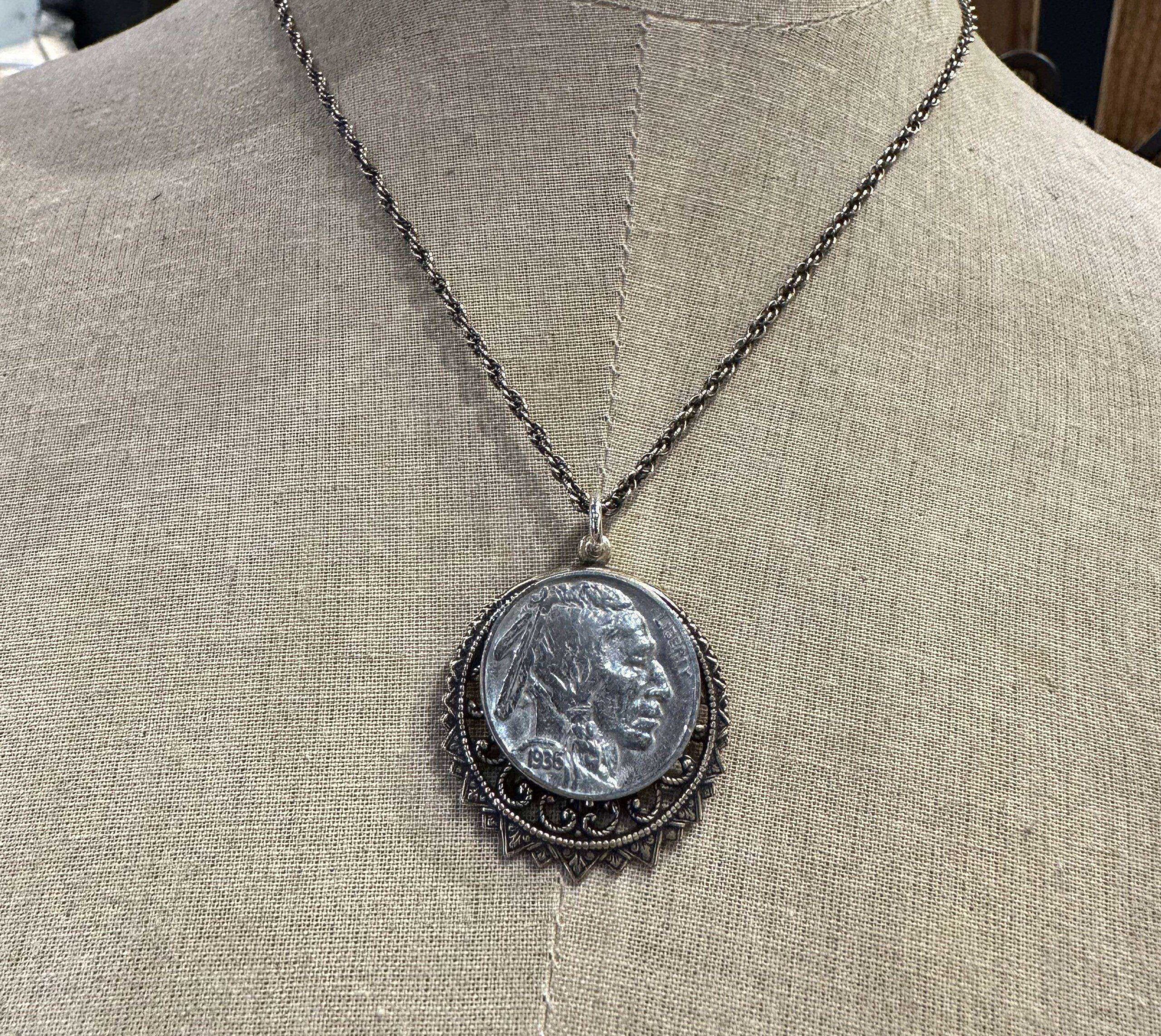 Indian Head Nickels were in production from 1913–1938. We hand select one of our favorites, and add a filigree layer. What a great way to wear a authentic piece of American History.  18″ length.
