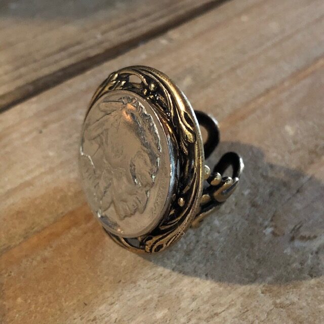 Wear a piece of American history. This handcrafted coin ring showcases an authentic Buffalo Nickel — minted between 1913 and 1938 — nestled in a delicate brass filigree setting. The intricate lacework of the filigree and band beautifully contrasts with the bold relief of the iconic Native American portrait on the coin.