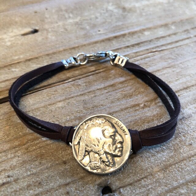 Indian Head Nickels were in production from 1913 until 1938. We hand select one of our favorites, and accent with supple deerskin leather. What a great way to wear a authentic piece of American History. Available in black or brown. 7 1/4″