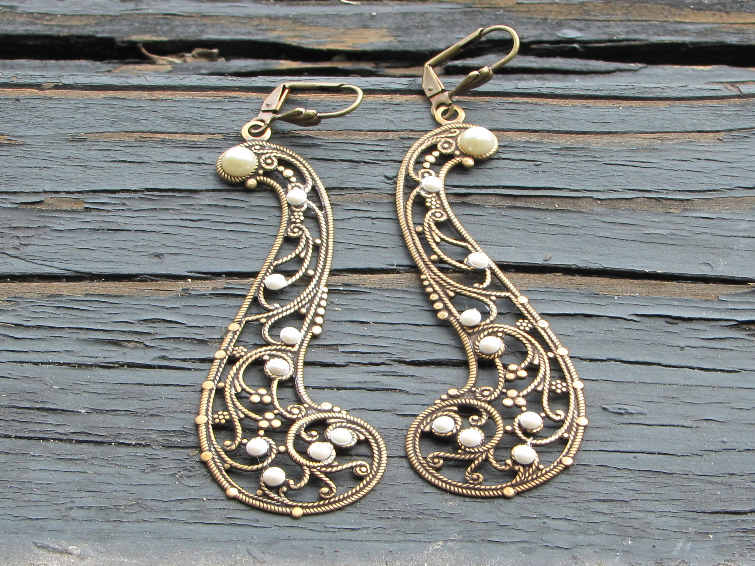 Our Crazy Paisley Earrings are super lightweight and are sure to add a little delicate drama to your wardrobe. Available in antique brass or antique silver. Both glow with gorgeous lustrous pearls. 2 1/4″ length.