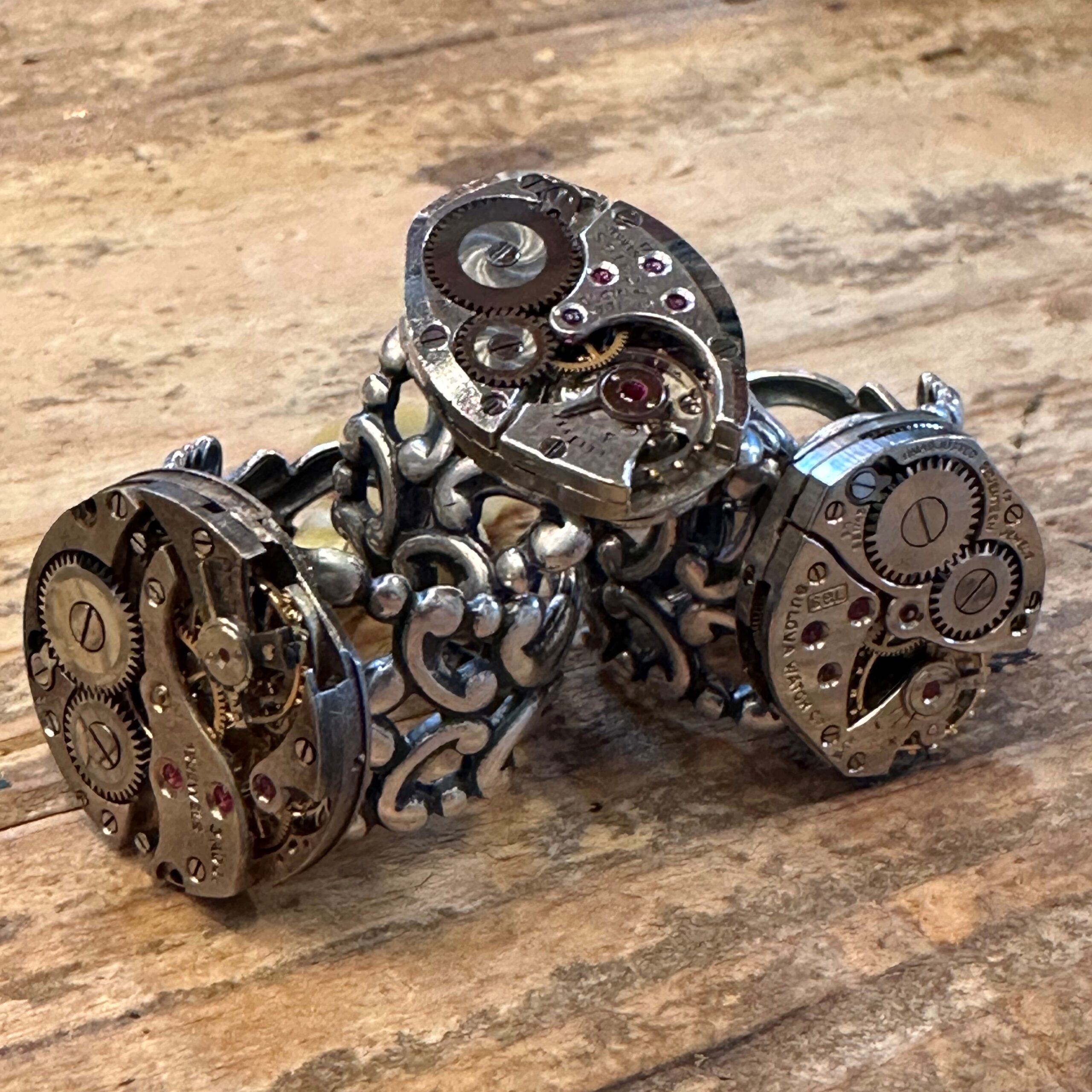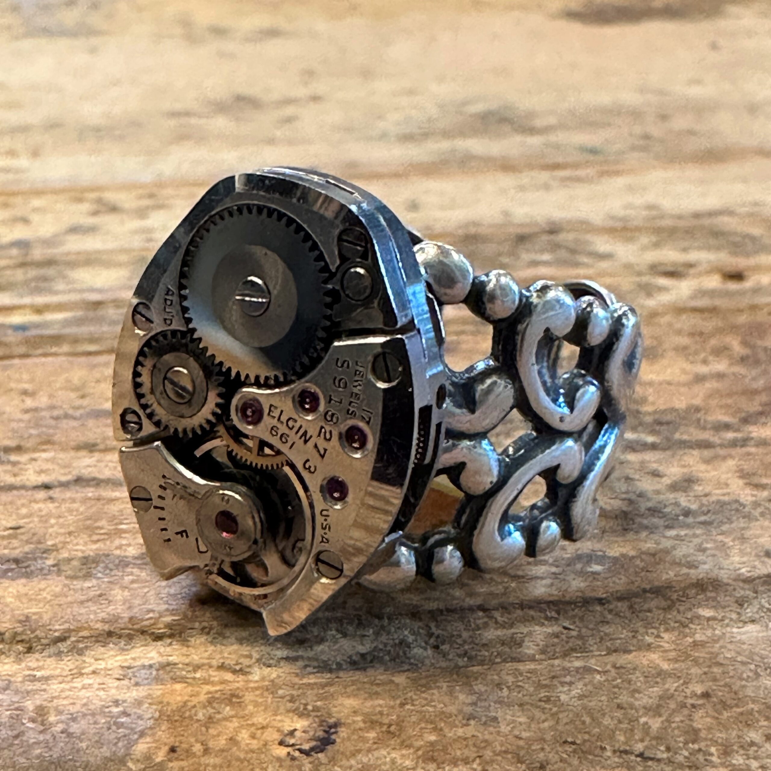 This sophisticated steampunk beauty features a vintage watch movement (a.k.a. watch inner workings) on a pretty filigree band. These movements would commonly say “17 jewels” or “some number” of jewels on the actual watch face, referring to the rubies. Why would someone waste rubies inside a watch?  They are used as bearings for moving parts due to their low friction and good wear characteristics. Low friction equates to increased accuracy in watch movements, so better watches use jewel bearings, even to this day.  Due to the nature of antiques, movements will vary, however quality and beauty will not.  Movements vary in size, but average 3/4″ x 5/8″.  Ring has a split band, so one size fits most.