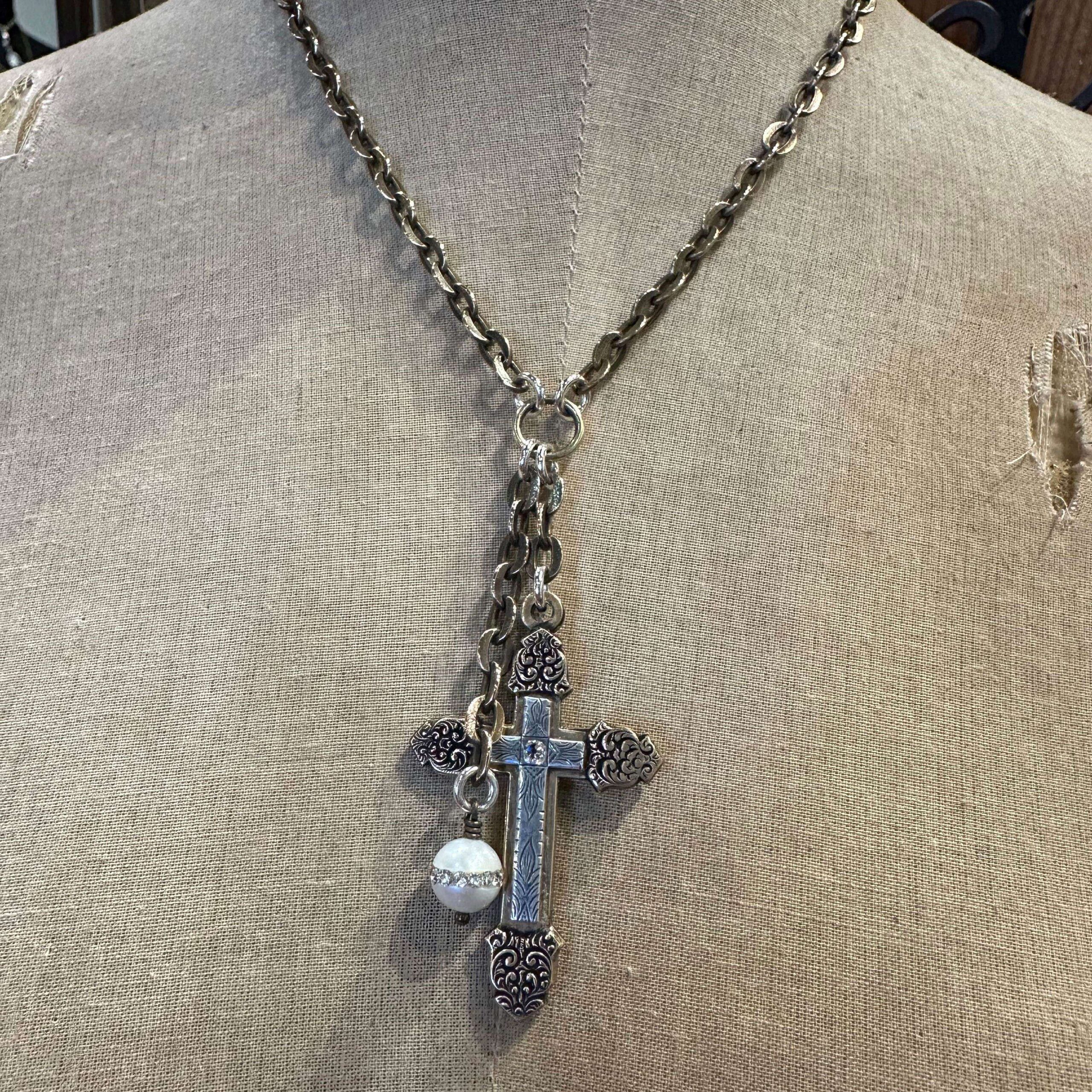 Our elegant Vatican City Y Necklace features a layered double-sided cross embellished with genuine Austrian crystal and a hand selected freshwater pearl. Always Mixed metal, with your choice of a teal or white crystal studded pearl. Cross measures 2″ x 1 1/4″ Length 18″.